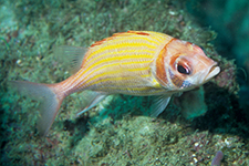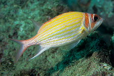 Yellow-striped squirrelfish(Yellow-striped = 黄色い縞の squirrel = リス) Gold-lined squirrelfish(Gold-lined = 金色の線の) |